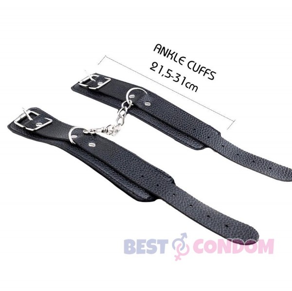 - Поножі для надійної фіксації ніг у будь-якому положенні! Поножі з'єднані знімним ланцюжком з карабіном, підходять для з'єднання з наручниками. М'які зсередини, регулюються за об’ємом від 21,5 до 31 см. Ширина 5 см.