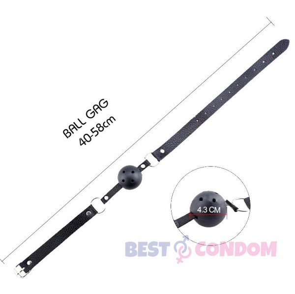 - Кляп із пластиковою кулькою: повітропроникний завдяки отворам, то ж його можна носити досить довгий час. Діаметр кульки 4,5 см, кріпиться на ремінці, об’єм регулюється від 40 до 58 см.