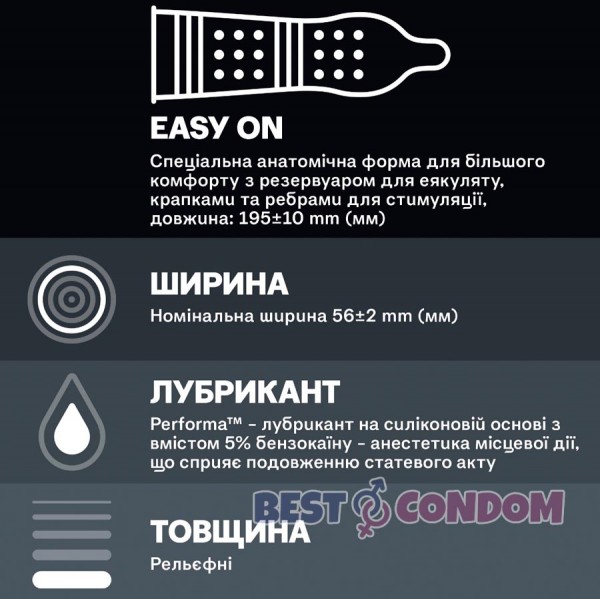 - Durex Dual Extase може сповільнювати еякуляцію чоловіків, а ребра та пухирці на поверхні презерватива допомагають посилити стимуляцію і прискорити настання оргазму жінки.