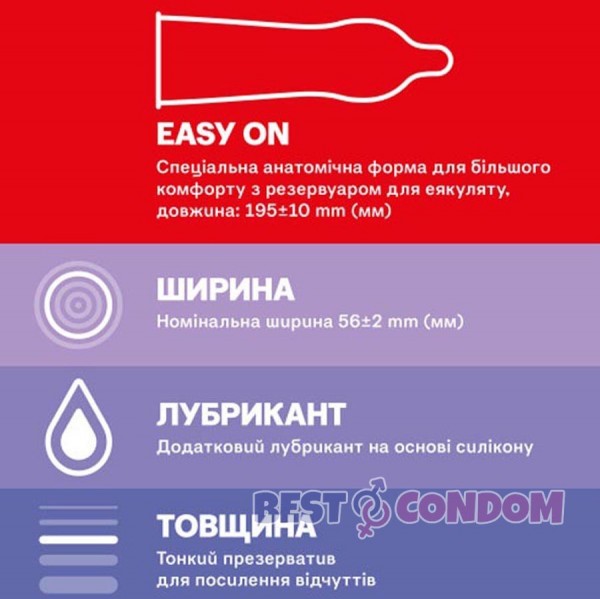Спеціальна анатомічна форма Easy-on (легкість у надіванні) для більшого комфорту, номінальна довжина: 195 ± 10 мм ширина: 56 ± 2 мм.