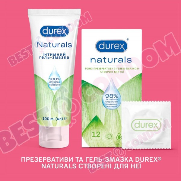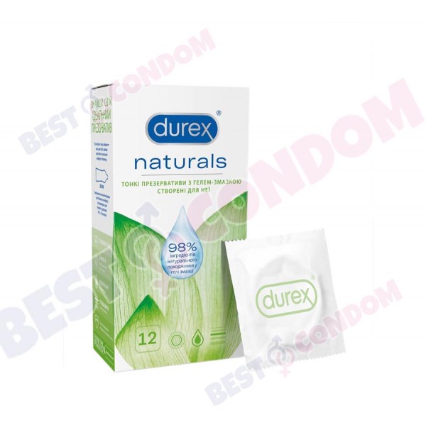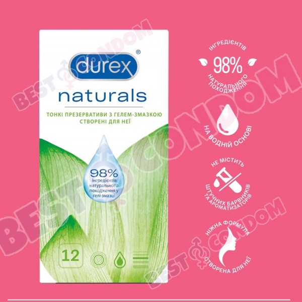 Durex Naturals — тонкі презервативи з гелем-мастилом створені для неї. Презервативи з натурального каучукового латексу, покриті гелем-мастилом на водній основі, що на 98% складається з інгредієнтів натурального походження й не містить штучних барвників і ароматизаторів. Ніжна формула. Розроблено спеціально для її задоволення Інтимний гель-мастило на 98% складається з інгредієнтів натурального походження Більше гелю-мастила для більшого комфорту під час сексу Тонкі презервативи для природних відчуттів. Не містить барвників і ароматизаторів.