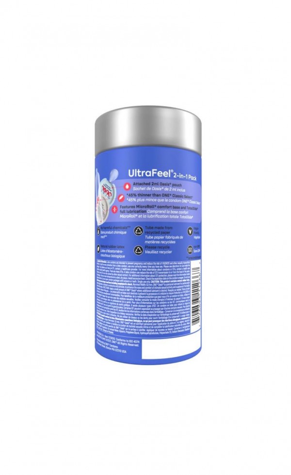 Ультратонкі та ультрам'які презервативи з додатковим пакетиком смазки. В упаковці ONE UltraFeel використовуються чотири нові передові технології: 1. Кожна упаковка містить ультратонкий презерватив у поєднанні з додатковим пакетиком смазки на 3 мл для вашого задоволення та комфорту. 2. Ультрам'який латекс SheerSkin: надтонкий презерватив, який менший за товщину людського волосу. 3. Комфортна основа MicroRoll: надтонка смужка в основі додаткового задоволення. 4. Технологія TotalGlide: смазка презерватива від основи до кінчика.