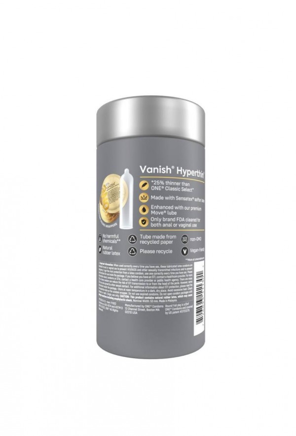 Ультратонкі презервативи Презервативи ONE VANISH Hyperthin удосконалені в технології ультратонкого латексу та зроблені ще м'якішими для найприємнішого інтимного контакту. На 35% тонкіші стандартного презерватива Зроблені із надм'якого латексу Sensatex Advanced Містить смазку ONE Move для легкого ковзання З накопичувачем Триразове тестування на безпеку та надійність