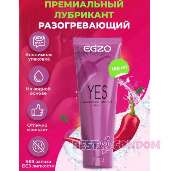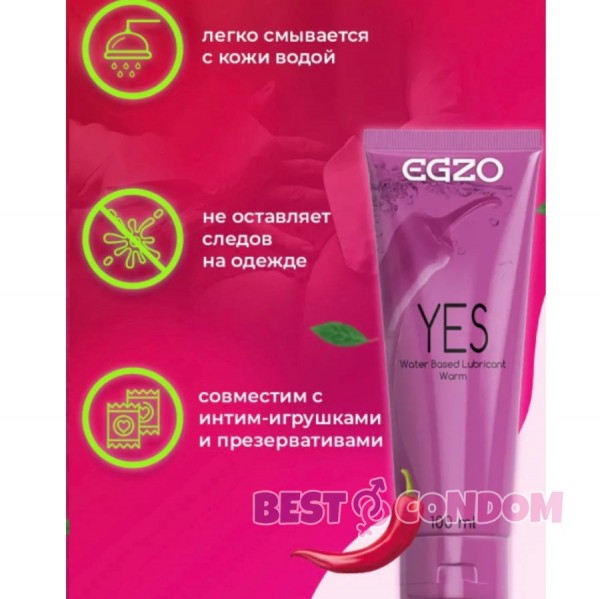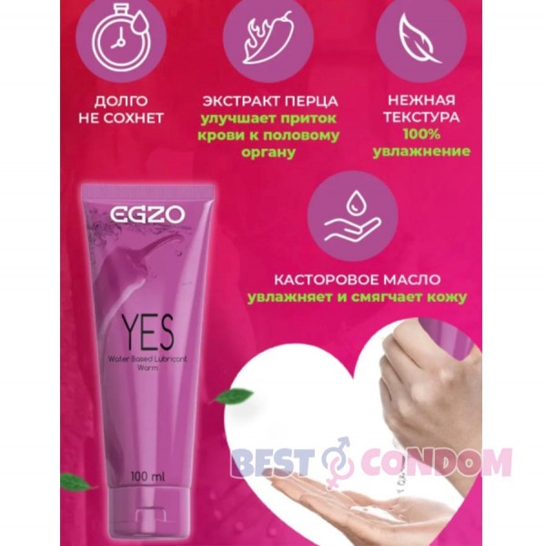 EGZO YES - якісний лубрикант із зігріваючим ефектом. Лубрикант не має кольору, смаку та запаху, розроблений на водній основі та підходить для використання з усіма видами інтимних іграшок.