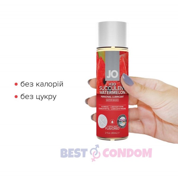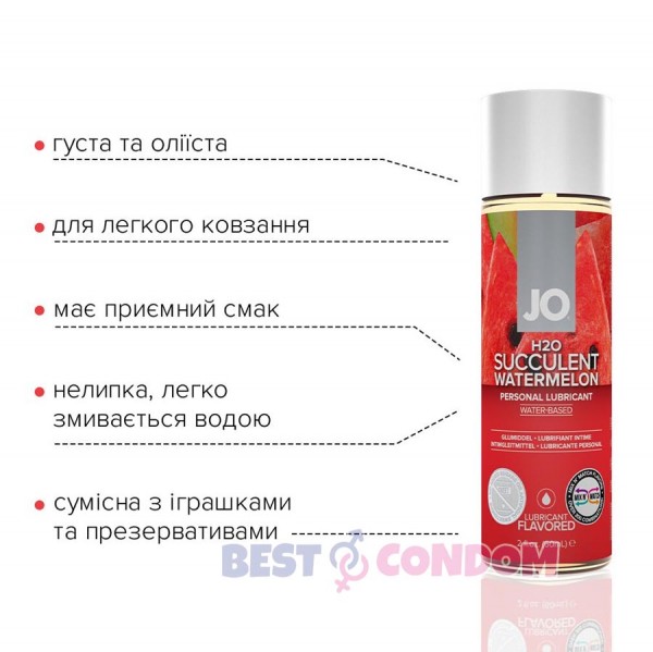 Лубрикант на водній основі System JO H2O — WATERMELON соковитий кавун — це інтимний лубрикант із широкою гамою насичених ароматів із колекції ароматизованих засобів JO® H2O.