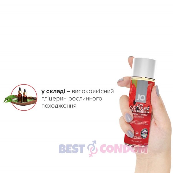 Лубрикант на водній основі System JO H2O — WATERMELON робить прелюдії більш приємними й поліпшує якість інтимної близькості. Виготовлений із використанням гліцерину виключно рослинного походження та натуральних ароматизаторів.