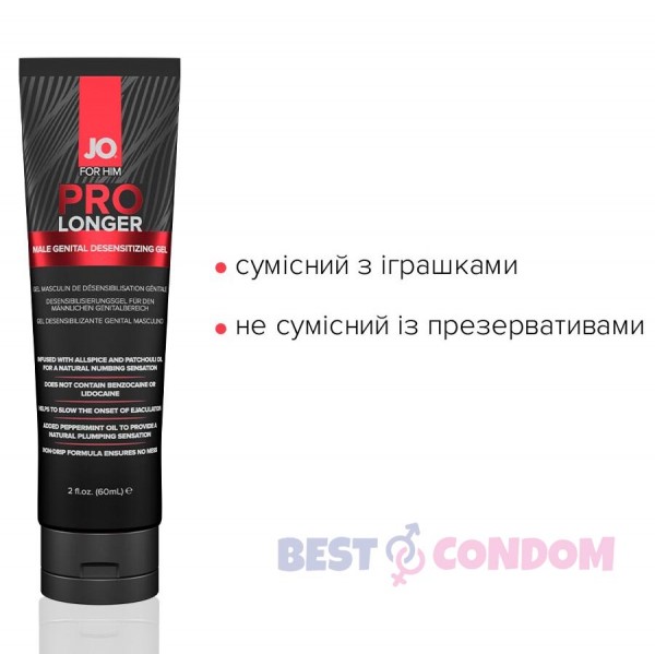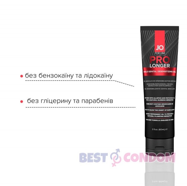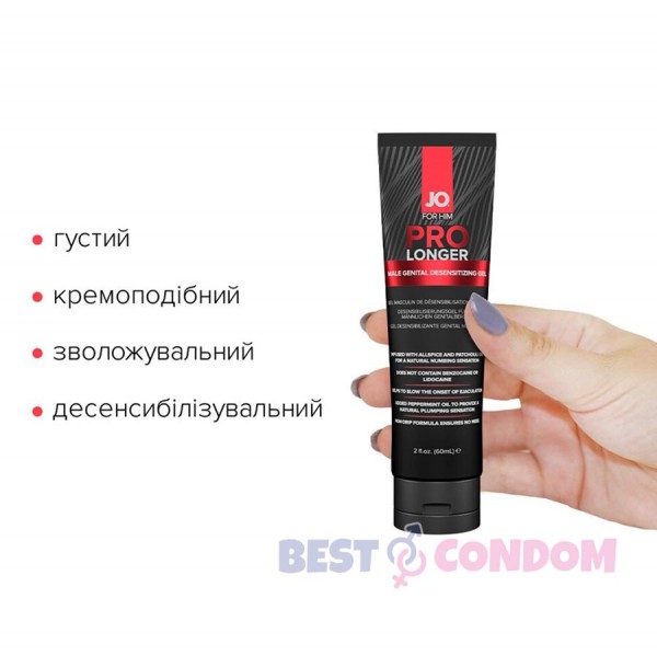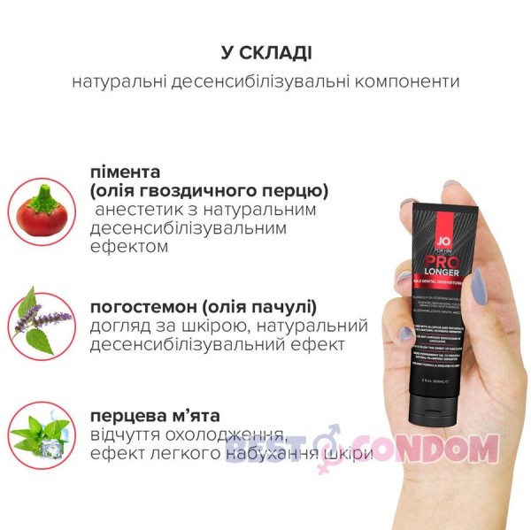 System JO Prolonger Gel — спеціалізований засіб у вигляді кремоподібного густого гелю для тривалого збереження ерегованого стану члена, що сприяє уповільненню настання еякуляції. Створений із використанням натуральних десенсибілізувальних інгредієнтів. Додавання олії перцевої м’яти, гвоздикового перцю та пачулів забезпечує не лише подовження статевого акту, але й чинить ефект набухання статевого органу. Ніжна кремова текстура для приємного нанесення. Ідеально підходить для тих, хто віддає перевагу більш м’якому впливу на чутливість. У формулі лубриканту не міститься бензокаїну, лідокаїну, гліцерину та парабенів.