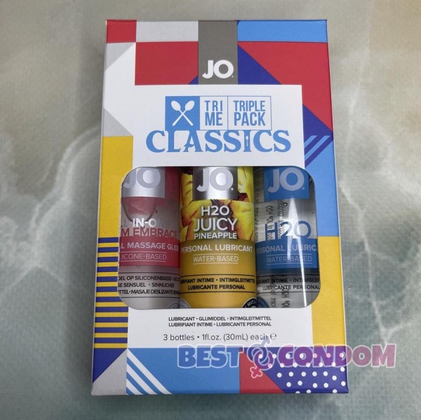 Набір складається з трьох популярних інтимних мастил: класичної на водній основі (Jo H2O Original), збудливий гель-лубрикант на силіконовій основі (JO All-In-One Massage Glide) – Warming, ароматизований лубрикант «соковитий ананас» (Jo Flavored Juicy Pineapple).