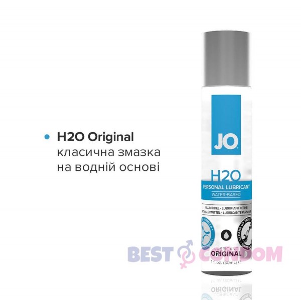 Jo H2O - інтимний лубрикант на водній основі. Входить до складу гліцерин виключно рослинного походження. Забезпечує комфортне ніжне ковзання без липкості.