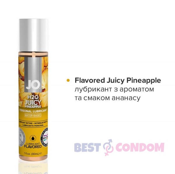 Jo Flavored Juicy Pineapple - PH-нейтральний інтимний лубрикант з насиченим ароматом ананаса. Входить до складу гліцерин виключно рослинного походження. Всі інгредієнти вищої якості і тільки натуральні харчові ароматизатори. Формула лубриканта не містить цукру, парабенів і пропіленгліколю. Забезпечує комфортне ніжне ковзання без липкості. Абсолютно безпечний для орального вжитку, не має післясмаку.