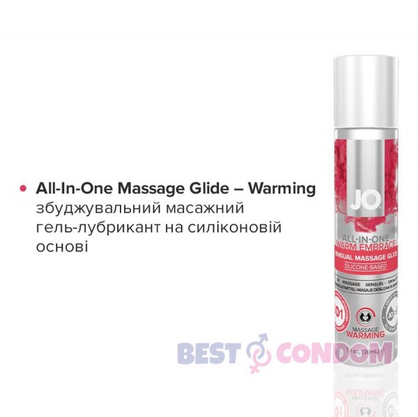 JO All-In-One Massage Glide – Warming – універсальна гель-змазка на силіконовій основі, яка містить стимулюючі речовини. Зігріваючі компоненти подарують додаткові приємні відчуття чуттєвого розслаблення. Гель-змазка має ідеальну консистенцію для масажу, масляниста структура без липкості і скочування створить неймовірну гладкість і шовковистість ковзання. А також робить нанесені на тіло татуювання яскравіше і зволожує шкіру. До складу гелю-змазки входить силікон найвищої якості.