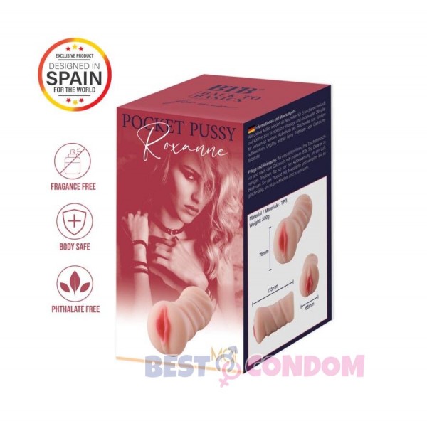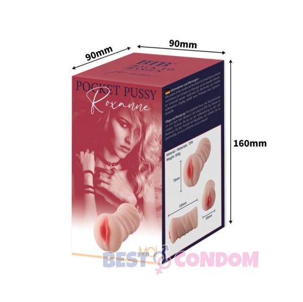 Мастурбатор-вагіна MAI Pocket Pussy Roxanne Flesh виготовлений з м’якого, приємного на дотик матеріалу TPR, його довжина всього 13,5 см, а ширина — 7,5 см. Завдяки матеріалу, з якого виготовлений мастурбатор, він добре тягнеться, не стискаючи і не доставляючи дискомфорту, тому дуже добре підійде на член середнього діаметра, м’яко обволікаючи і стимулюючи. Рельєфна поверхня перешкоджає ковзанню мастурбатора у руці.